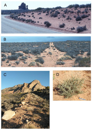 - Richardson, B.; Kitchen, S.G.; Pendleton, R.L.; Pendleton, B.K.; Germino, M.J.; Rehfeldt, G.E.; Meyer, S.E. Adaptive responses reveal contemporary and future ecotypes in a desert shrub. Ecol. App. 2014, 24, 413–427. [Google Scholar] [CrossRef] [PubMed]