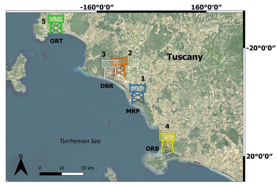 The study area was made up of four protected areas within an extensive coastal wetland system in southern Tuscany (central coastal Italy). The nest sites were located in: Maremma Regional Park (MRP−regional park; 1 breeding pair; NEST_1), Diaccia Botrona Natural Reserve (DBR−natural reserve; 2 breeding pairs; NEST_2 and NEST_3); Orbetello Lagoon (ORB−WWF natural reserve; 1 breeding pair; NEST_4), Orti-Bottagone Marsh (ORT−WWF natural reserve; 1 breeding pair; NEST_5) (Figure 1). The mean distance among nests sites is 32.7 km (range: 1.1−73.9 km). In these sites, ospreys reproduce in artificial nests built on three-pole structures equipped with video surveillance systems installed in the framework of the project. Internet protocol (IP) cameras with a 3X optical zoom, 2- and 4-megapixel sensors and full-HD resolution 1920 × 1080 were used. The camera registry program (CRP) was set on video mode recording nonstop 24 h/day. Cameras recorded in color during daylight hours and switched to black and white (using infrared vision) at night, allowing constant monitoring of the ospreys’ activity. The Tyrrhenian Sea, lagoons, rivers, saltwater marshes and channels characterizing the study area provide highly suitable fishing grounds for ospreys [41]. At these sites, population monitoring takes place routinely. Breeding events are kept under daily surveillance through nest video recordings, accompanied by weekly field surveys, allowing the recording of key breeding dates and parameters.