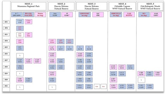 Graphic scheme of nests and reproductive events between 2011 and 2021. BELLOQ is the unringed male that in 2020 replaced I1-E4647 in NEST_1 and the father of solely the two chicks hatched in 2020 in NEST_1 (1-IBM-E2427 and 1-IBS-E2428). Two individuals hatched in 2011 and in 2016 in NEST_1 and NEST_3 (indicated by *), upon reaching sexual maturity, reproduced in the NEST_2 and NEST_5 (see notes below), respectively. In black are the ospreys sampled, while in red are reported other individuals of the population that have not been sampled for this study. Blue and pink squares indicate male and female birds, respectively. ** = individuals translocated during 2006–2010 that became successful breeders; ° = non-translocated Corsican adult female (ringed in Corsica as a pullus) that naturally settled in NEST_4 in 2018; n.a. = two individuals hatched in NEST_3 in 2021 but not ringed/sampled. \ = indicates unsuccessful breeding events (e.g., eggs did not hatch or pullus died before fledging).