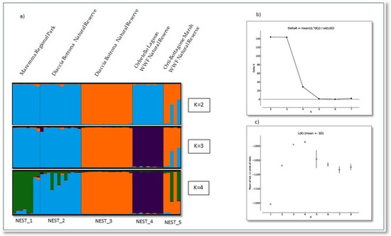 Results from the Bayesian analysis conducted in POP_2. Following the delta K procedure, the best clusters were described at K = 3 and K = 4. Genetic components reflect what is known about the two chicks hatched in NEST_1 after the male replacement, IAA-E1150 that originated in NEST_1 and reproduced in NEST_2, and IAE-E1053 that was hatched in NEST_3 and reproduced in NEST_5. (a) Bar plots at K = 3, K = 4 and K = 5; (b) delta K and (c) mean likelihood curve to identify the best K.