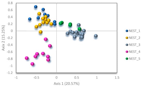 The factorial analysis of correspondence (FCA) produced similar results to the main proximity in the plot of NEST_1–2 and NEST_3–5 (Figure 4).
