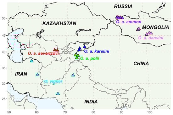 - Nasonov, N.V. Geographical Distribution of Old-World Wild Sheep; Printing house of Russian State Academy: Petrograd, Russia, 1923; p. 255. (In Russian) [Google Scholar]