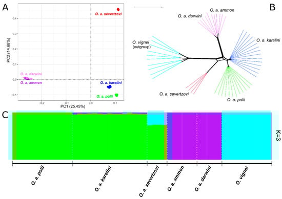 Dotsev, A.; Koshkina, O.; Kharzinova, V.; Deniskova, T.; Reyer, H.; Kunz, E.; Mészáros, G.; Shakhin, A.; Petrov, S.; Medvedev, D.; et al. Genome-Wide Insights into Intraspecific Taxonomy and Genetic Diversity of Argali (Ovis ammon). Diversity 2023, 15, 627. https://doi.org/10.3390/d15050627