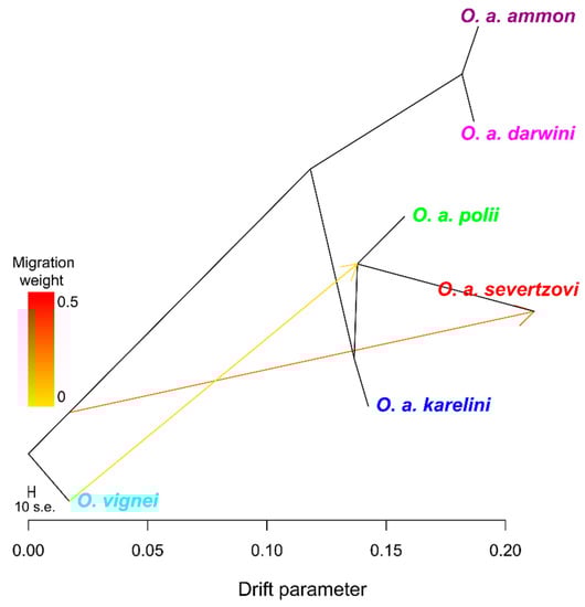 4.1. The Phylogenetic Relationship between O. a. ammon and O. a. darwini
