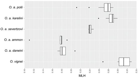 | O. a. ammon | 6 | 0.173 ± 0.001 | 0.203 ± 0.001 | 0.128 [0.124; 0.132] | 1.484 ± 0.002 | 0.179 [0.110; 0.191] |