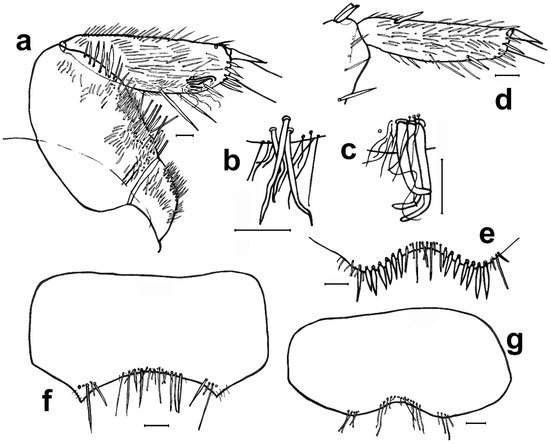 Some characteristics defining groups inside myrmecophilous Lepismatinae. (a): Hind leg of the male of Tricholepisma aureum, showing specialized chaetotaxy on tibia, femora, and trochanter. (b,c): group of strong and more or less hooked spines of the apical half of the tibiae of two specimens of T. aureum. (d): Metatibiae of the male of Neoasterolepisma pallidum, not modified with respect to those of the female. (e): Hind margin of the VII urosternite of N. lusitanum, showing strong sclerotized spines. (f): Seventh abdominal sternite (urosternite VII) of N. crassipes, showing pseudostyli in its hind margin. (g): Urosternite VII of N. curtiseta, with 1 median and 1 + 1 lateral usual bristle-combs, without modified chaetotaxy or shape of the hind margin. Scales: 0.1 mm.
