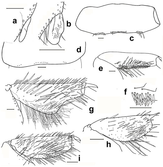 This group includes six species lacking modified spines in their abdominal sternites but some lateral acute expansions in the seventh urosternite, called pseudostyli (Figure 4f).