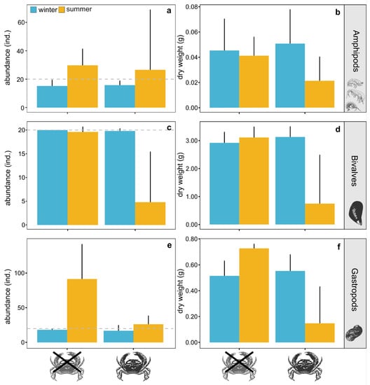 Abundance and biomass (expressed as dry weight) of amphipods (a,b), bivalves (c,d), and gastropods (e,f) observed at the end of the experiment in treatments with and without the mud crab Rhithropanopeus harrisii under simulated summer (yellow) and winter (blue) conditions. Bars represent mean values and whiskers confidence intervals at 95%. Horizontal dashed lines indicate the abundance of the different groups at the beginning of the experiment.