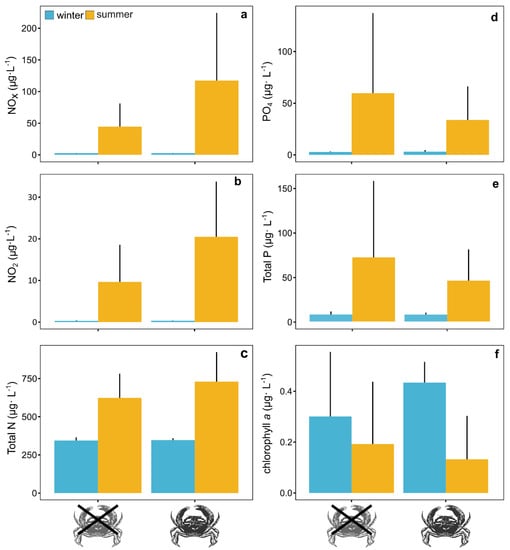 Nutrient (a–e) and chlorophyll a (f) concentrations in treatments with and without the mud crab Rhithropanopeus harrisii under simulated summer (yellow) and winter (blue) conditions. Bars represent mean values and whiskers confidence intervals at 95%.