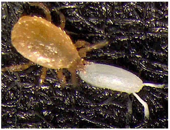 - Durkin, E.S.; Proctor, H.; Luong, L.T. Life history of Macrocheles muscaedomesticae (Parasitiformes: Macrochelidae): New insights on life history and evidence of facultative parasitism on Drosophila. Exp. Appl. Acarol. 2019, 79, 309–321. [Google Scholar] [CrossRef]