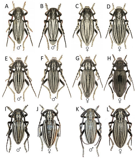 - Tavakilian, G.; Chevillotte, H. Titan Database about Longhorns or Timber-Beetles (Cerambycidae). Available online: http://titan.gbif.fr (accessed on 20 February 2023).