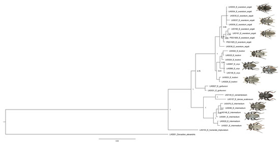 - Souza, D.S.; Marinoni, L.; Monné, M.L.; Gómez-Zurita, J. Molecular phylogenetic assessment of the tribal classification of Lamiinae (Coleoptera: Cerambycidae). Mol. Phylogenet. Evol. 2020, 145, 106736. [Google Scholar] [CrossRef] [PubMed]