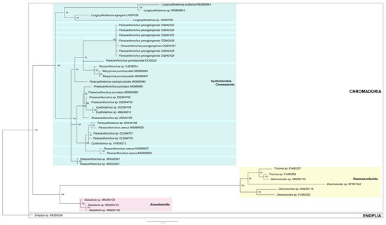 - Leduc, D.; Zhao, Z. Phylogenetic relationships within the Cyatholaimidae (Nematoda: Chromadorida), the taxonomic significance of cuticle pore and pore-like structures, and a description of two new species. Mar. Biodivers. 2018, 48, 217–230. [Google Scholar] [CrossRef]