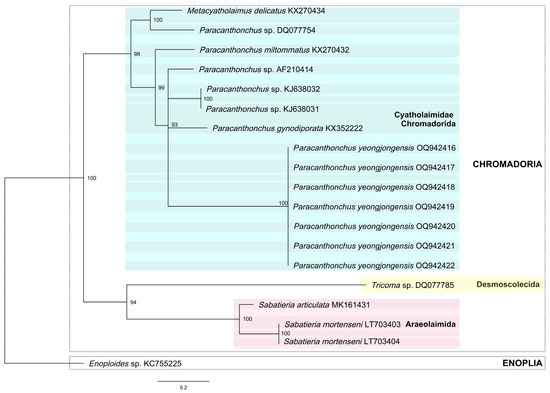 Kim, H.; Lee, W.; Jeong, R. Molecular Phylogeny of the Genus Paracanthonchus (Nematoda: Chromadorida) with Description of P. yeongjongensis sp. nov. from Korea. Diversity 2023, 15, 664. https://doi.org/10.3390/d15050664