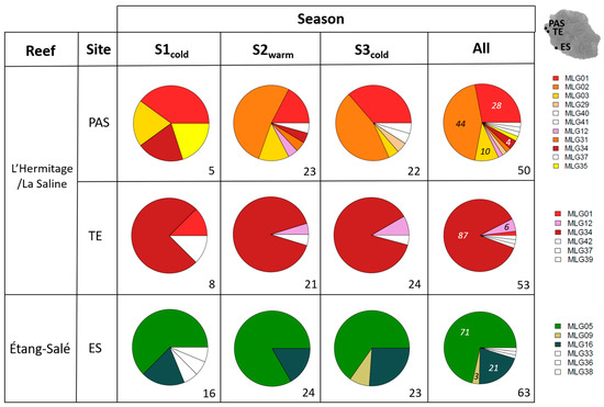 Spatial and temporal clonal distribution of Stichopus chloronotus. Numbers of individuals are indicated at the bottom right. MLGs are coloured following a previous study [31]. MLGs in white are unique over the previous study [31] and this study. Percentages of each MLG are indicated for the column “All”. PAS: Passe de l’Ermitage, TE: Trou d’Eau, ES: Étang-Salé. S1cold: austral cold season 2019, S2warm: austral warm season 2020, S3cold: austral cold season 2020.