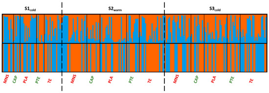 Assignment tests for Holothuria leucospilota individuals for the three seasons (S1cold, S2warm, S3cold) and each site. Above: Structure plot at K = 2, and below: DAPC assignments at K = 2. High density sites in red: MNS: Maître-Nageur-Sauveteur, PLA: Planch’Alizé, TE: Trou d’Eau. Low density sites in green: CAP: Cap-Méchant, PTE: Petit Trou d’Eau.