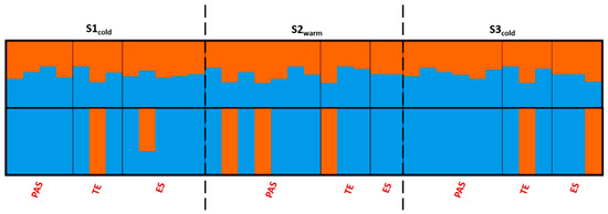 Assignment tests for Stichopus chloronotus individuals for the three seasons (S1cold, S2warm, S3cold) and each site. Above: Structure plot at K = 2, and below: DAPC assignments at K = 2. PAS: Passe de l’Ermitage, TE: Trou d’Eau, ES: Étang-Salé.