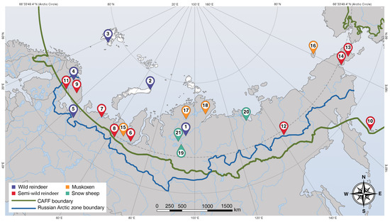 Fecal sampling was done for three host species, reindeer (R. tarandus), muskoxen (O. moschatus), and snow sheep (O. nivicola), inhabiting the Arctic area of Russia (Figure 1, Table 1). Territory was defined according to the Conservation of Arctic Flora and Fauna (CAFF) boundary and the Russian Arctic zone boundary. Additionally, we included a site at Svalbard (Norway) due to the Svalbard Treaty recognizing right of Russia (along with many other countries) to engage in commercial activity on the islands of the Archipelago of Spitsbergen, and the actual use of this right.