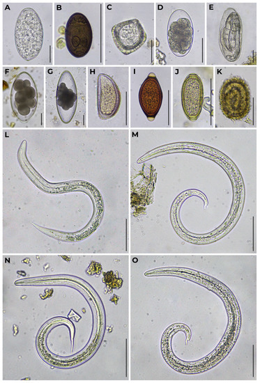 Diagnostic stages of helminths obtained from feces of reindeer (R. tarandus). (A) Paramphistomum sp. egg; (B) Dicrocoelium sp. egg; (C) Moniezia sp. egg; (D) Strongyle-type egg; (E) Marshallagia sp. egg (embryonated, dead); (F) Nematodirus sp. egg; (G) Nematodirella longissimespiculata egg; (H) Skrjabinema tarandi egg; (I) Trichuris sp. egg; (J) Capillaria sp. egg; (K) Possibly, Ascaris mosgovoyi egg (embryonated, dead); (L) Dictyocaulus sp. first-stage larva (L1); (M) Elaphostrongylus rangiferi L1; (N) Orthostrongylus sp. (possibly, O. macrotis) L1; (O) Varestrongylus eleguneniensis L1 (dead). Bright field microscopy, 40× objective lens magnification. Scale bar equals 50 μm.