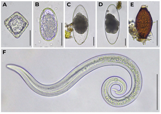 Diagnostic stages of helminths obtained from feces of muskoxen (O. moschatus). (A) Moniezia sp. egg; (B) Strongyle-type egg; (C) Nematodirus sp. egg; (D) Nematodirella sp. egg; (E) Trichuris sp. egg; (F) first-stage larva (L1) of the family Protostrongylidae. Bright field microscopy, 40× objective lens magnification. Scale bar equals 50 μm.