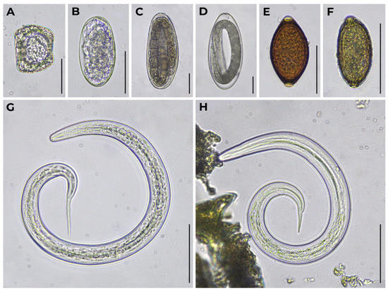 Diagnostic stages of helminths obtained from feces of snow sheep (O. nivicola). (A) Moniezia sp. egg; (B) Strongyle-type egg; (C) Marshallagia sp. egg (embryonated, dead); (D) Nematodirus sp. egg (embryonated); (E) Trichuris sp. egg; (F) Capillarid-type egg; (G) Protostrongylus sp. first stage larva (L1) with a longer tail spike (sample set #23); (H) Protostrongylus sp. L1 with a shorter tail spike (sample set #24). Bright field microscopy, 40× objective lens magnification. Scale bar equals 50 μm.