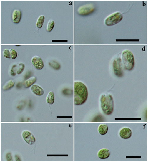Heterochlamydomonas uralensis sp. nov.: (a–e) motile cells, with slightly uneven flagella; (f) non-motile vegetative cells. Scale bars: 10 μm.