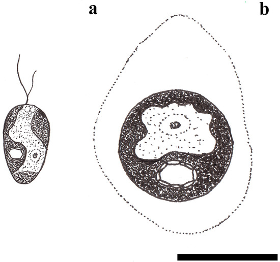 Drawings of Heterochlamydomonas uralensis sp. nov. (a)—motile cells, (b)—old non-motile vegetative cells with mucilage. Scale bar: 10 μm.