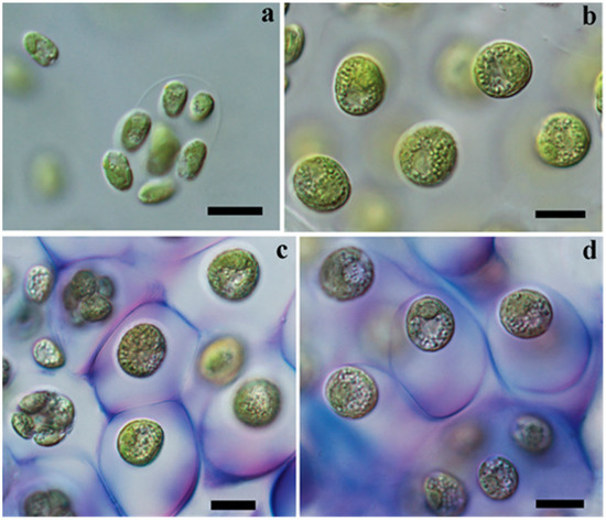 Heterochlamydomonas uralensis sp. nov. (a)—zoospore release from zoosporangium, (b–d)—old non-motile vegetative cells, (c–d)—cells surrounded by delicate mucilage. Mucilage was visualized with methylene blue. Scale bars: 10 μm.