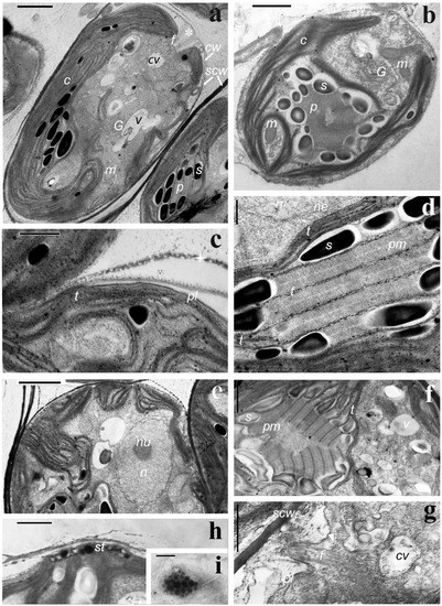 Cells are covered by a thin (~100 nm) cell wall (Figure 4a–c), consisting of a small portion of fibrils and thin, tightly enclosed electron-dense lamella (Figure 4c). Papilla is absent, but the cell wall is considerably thicker at the apical end, in the region of the flagella outlet (Figure 4a). The dark mucilage-like component is visible outside the individual cell wall, and it contains perforations (Figure 4c). The latter can partially peel off from individual sporangial cells; if not, it forms a very dark sporangial cell wall, which, as the sporangia grows, also stratifies into thicker fragments (Figure 4a,e,g). Plasmalemma is smooth and contacts with a chloroplast envelope only in a few areas (Figure 4c). Chloroplast thylakoids are predominantly long, straight, sometimes curved, and organized in packs of two and three units each, rarely reaching 5–6 units (Figure 4a–f). The chloroplast thylakoid packs are common with the same of a pyrenoid body and likely do not change their form entering but reduce their number up to two (Figure 4d). Pyrenoid sheath consists of 10–20 small starch grains with various shapes and sizes and surrounds the pyrenoid body. The pyrenoid body is highly ordered. It consists of equal portions of the matrix and paired thylakoids regularly penetrating it. Thylakoids are generally straight (Figure 4d,e). Occasionally, thylakoids in the pyrenoid lie in different directions (Figure 4f). In a few sections, the pyrenoid body looks almost homogeneous (Figure 4b). This is due to the architecture and the dissection site of the pyrenoid itself (Figure 4f). Stigma is rarely observed. It is located under the chloroplast envelope and formed by one layer of densely adjacent dark globules (Figure 4h,i). Starch grains in chloroplast are few; their form and sizes are similar to that of the pyrenoid envelope (Figure 4a–c,e). The single nucleus is bounded by a double membrane with almost regular pores and contains weakly condensed chromatin and a central nucleolus with an ordered arrangement of granular and fibrillar components (Figure 4e). Near the nucleus, there are usually one or two Golgi bodies of about five cisternae and a small number of vesicles. Mitochondria are predominantly centrally located (near the nucleus and flagellar apparatus) and are represented mainly by small profiles; their cristae are small and flattened. There are the following types of vacuoles: homogeneous light, with dark contents, with membrane components and two contractile vacuoles (Figure 4a,b,e–g). The latter are observed at the apical cell end, near the flagella. The flagellar bases are located almost parallel to each other (Figure 4a). On some sections, a 3 + 1 fragment of the microtubule root and the transition zone of flagella (Figure 4g) is distinguished.