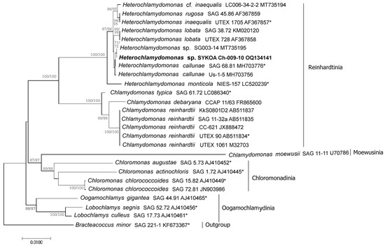 The monophyletic genus Heterochlamydomonas was described in 1969 using light microscopy by Cox and Deason [1]. The genus comprises a small group of single-celled green algae with motile cells having two flagella of different lengths and parallel basal bodies [2]. Now, Heterochlamydomonas includes five species: H. callunae (H. Ettl) Mikhailyuk & Demchenko, H. inaequalis Ed.R. Cox & Deason, H. lobata M.F. Langford & Ed.R. Cox, H. monticola (Shin Watan.) Shin Watan. and H. rugosa M.F. Langford & E.R. Cox [3,4]. The type species (holotype) of the genus H. inaequalis was isolated by Cox and Deason from the soil of a cedar glade in Cedars of Lebanon State Forest, Wilson County, TN, USA, and was described in 1969 [1]. Two species, H. lobata and H. rugosa, were described by Langford and Cox in 1971 [5]. These species were collected from surface soil along the rim of the deep gorges in Fall Creek Falls State Park (Van Buren, TN, USA). H. lobata was also found in Canada, Devon Island, in freshwater, and H. rugosa in Scotland, Isle of Ulva, in freshwater [4]. H. callunae and H. monticola were assigned to this genus recently [3,6]. Previously, both taxa were members of the genus Chlamydomonas [7,8]. Their redescription was made based on DNA marker sequence analysis (SSU rRNA and ITS regions) and morphological data [3,6]. H. callunae probably lives in the soil. The authentic strain of H. callunae/C. callunae was isolated from the soil of a degraded pine forest with a predominance of Calluna vulgaris, Czech Republic [7,9]. It has also been found in the soil of various natural zones in Germany, Ukraine and Russia [6,10,11,12]. H. monticola was isolated from the soil sample collected from Mount Hakuba (Mount Shirouma), Japan [8].
