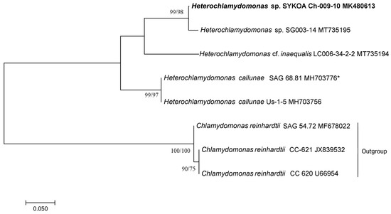 Thus, the studied strain has the maximum similarity to the strain Heterochlamydomonas sp. SG003-14. Unfortunately, the article by Samolov et al. [32], which mentions Heterochlamydomonas sp. SG003-14, contains no morphological or ultrastructural description of the species. Thus, it is not possible to verify how close the two strains are in terms of morphology. The strain SG003-14 isolated from the habitat in the semiarid zone of South America (Nature Reserve Santa Gracia) strongly differed from the habitat of SYKOA Ch-009-10 (cold and moist soil, Subpolar Urals, Yugyd Va National Park). So, we suggest the SYKOA strain Ch-009-10 as a new species.