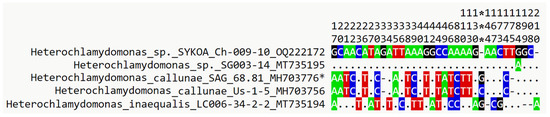 Analysis of the 18S and ITS2 rDNA sequences of the SYKOA Ch-009-10 strain showed high similarity of 100% and 99%, respectively, with Heterochlamydomonas sp. SG003-14 [32]. Analysis of the secondary structure of ITS2 of Ch-009-10 and SG003-14 strains showed polymorphism in only one position, 184. Secondary structure analysis of the Ch-009-10 strain and the authentic SAG 68.81 strain revealed 17 substitutions (including 3 CBCs) and 3 indels. All CBCs substitutions are located in the Helix I region. Currently, the concept of Coleman [34] to distinguish taxa based on compensatory substitutions in conserved ITS2 sites is not relevant for all species of Chlorophyta [35]. However, for the asexual-propagating algae, compensatory substitutions are important molecular indicators for distinguishing the species. We identified three CBCs between the strains SYKOA Ch-009-10 and SAG 68.81. Despite the morphological similarity of the studied strain SYKOA Ch-009-10 compared with the SAG 68.81 strain, the quantity of changes found in ITS2 may be an additional sign of the species specificity of SYKOA Ch-009-10. The strain SYKOA Ch-009-10 has the most similarity with Heterochlamydomonas sp. SG003-14 is based on both 18S gene data and the secondary structure of ITS2. In the strains studied, from a total alignment length of 223 nucleotide positions, we identified 33 polymorphic sites in ITS2. Seventeen of them were parsimony informative (Figure 8). The genetic distance calculated from the p-distance between the strains of Heterochlamydomonas sp. SYKOA Ch-009-10 and SG003-14 was 0.5%, while with other strains, it was about 8%.