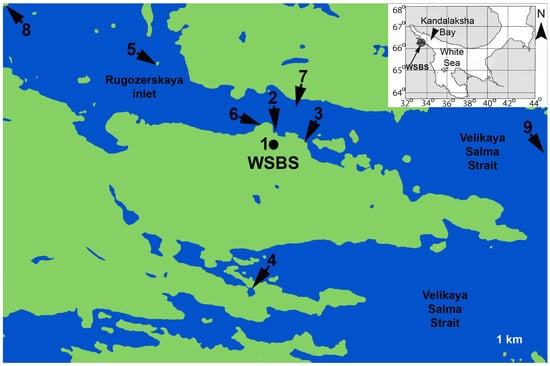 Sampling localities in the White Sea. Location of the WSBS in the White Sea is shown at the inset. Abbreviations: WSBS—White Sea Biological Station; 1—aquarium at WSBS; 2—pier of WSBS; 3—Eremeevskie rapids; 4—saline lake at the Green Cape; 5—location “Luda”; 6—location “Krest”; 7—Rugozerskaya inlet, depth 5–15 m; 8—Polovye islands; 9—Velikaya Salma Strait, depth 40–60 m.