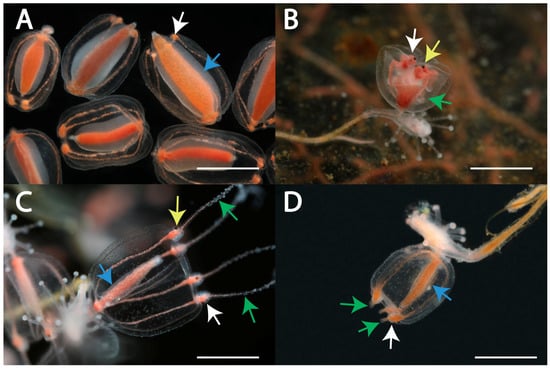 Four morphotypes of gonophores in specimens of Sarsia lovenii from the White Sea: morphotype I—medusoid specimens H347 detached from the polyps (A), morphotype II—bud of free-swimming medusa specimen H167 (B), morphotype III—attached medusa specimen H140 (C), morphotype IV—“abnormal medusoid” specimen H341 (D). Abbreviations: yellow arrows indicate ocelli, green arrows indicate tentacles, white arrows indicate tentacular bulbs and blue arrows indicate gonad covering manubrium. Scale bars 1 mm.