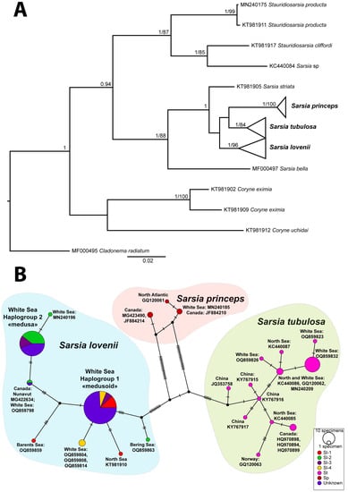 Phylogenetic analyses of COI dataset: (A) Bayesian and maximum-likelihood phylogenetic hypotheses. Numbers near branches show posterior probabilities (>0.95) and bootstrap values (>70). (B) Haplotype network. Abbreviations: morphotypes of gonophores Sarsia lovenii (Sl-1–Sl-4) relate to morphotypes I–IV in the Figure 2. St—Sarsia tubulosa; Sp—Sarsia princeps; Unknown—specimens lacked ripe gonophores.