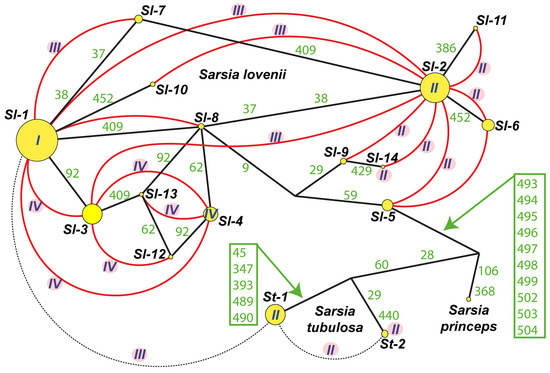 Haplotypes net for ITS dataset including Sarsia lovenii, Sarsia tubulosa and Sarsia princeps. List of specimens see in Table S4. Abbreviation: Sl-1–Sl-14—haplotypes S. lovenii, St-1–St-2—haplotypes S. tubulosa; I–IV—morphotypes of gonophores for haplotypes or hybrid specimens (I—medusoid, II—medusa, III—attached medusa and IV—abnormal medusoid); Green numbers—variable loci in ITS dataset (see Table S3); Yellow circles—haplotypes ITS, size of circle relates to number of specimens; Black solid lines—connection between haplotypes; Red curves illustrate crossing between haplotypes; The dotted line indicates crossing between st-1 and st-2 haplotypes, as well as experimental interspecies hybrid between St-1 and Sl-1.