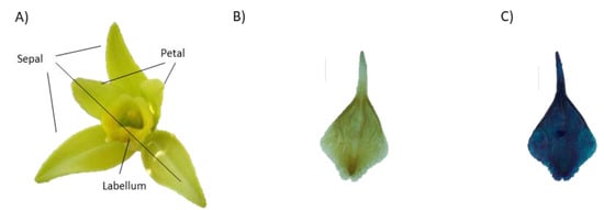 (A) Flower of Vanilla planifolia Andrews. (B) Dissection of the labellum. (C) Staining of the labellum. Scale bar: 1 cm.