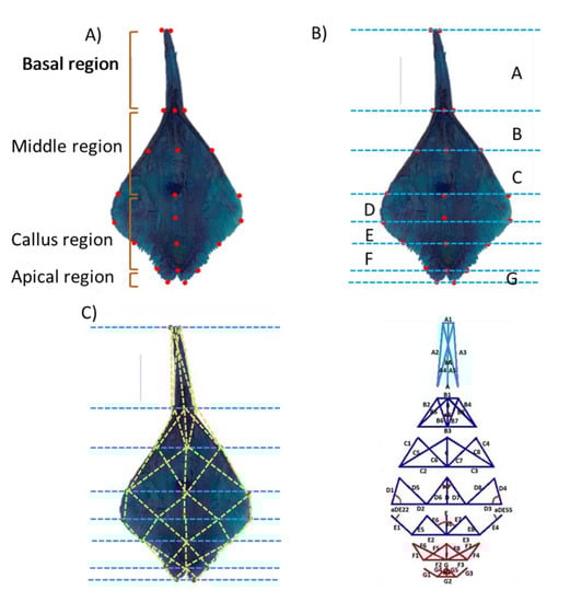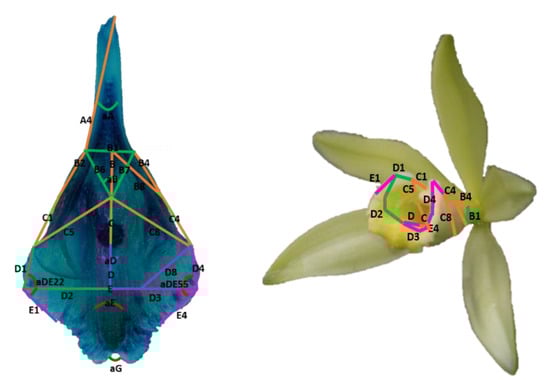 The procedure to characterize the labellum was based on Hernández-Ruíz et al. [] and Lima-Morales et al. []. First, the labellum stored in a preservative solution was stained with methylene blue (0.08%) (Figure 2B,C). Photographs were taken at a distance of 30 cm with a Sony digital camera (SONY α, DSLR-SLT-A55) equipped with a macro lens (Sony DT 30 mm F/2.8 SAM). Once the digital images of all of the flowers were obtained, the initial landmark points were placed (Figure 3A). In the curved regions, extra points were added without overloading the contour edges so as not to generate redundant information []. With the first landmark points, the labellum was separated into seven regions: A, B, C, D, E, F, and G (Figure 3B). Then, the secondary lines were placed to record the entire shape of the labellum; thus, a total of 57 lines and 7 angles (morphological variables) were obtained (Figure 3C).