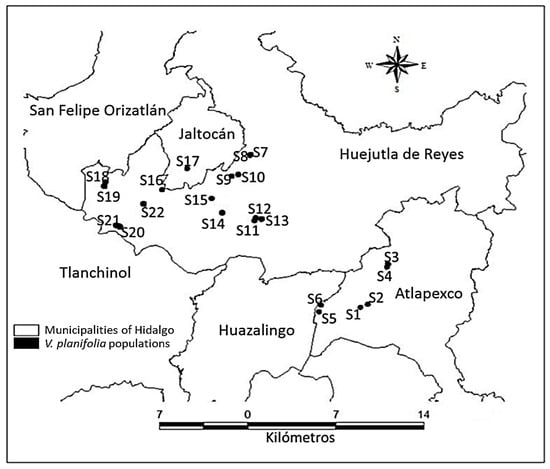 Locations of the 22 accessions of V. planifolia in the Huasteca of Hidalgo.