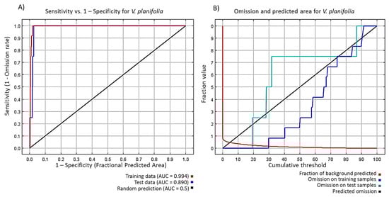 Validation of the potential distribution model of V. planifolia in the Huasteca of Hidalgo. (A) Sensitivity versus specificity. The red curve represents the fit of the model to the sample data. The blue curve indicates the degree of adjustment of the model to the test data, which is the real test of the predictive power of the model. The black line represents the expected line if the model were no better than random. (B) The omission rate of the model created by MaxEnt and the cumulative threshold of the predicted area. If the omission on the test samples is close to the predicted omission, the distribution model for V. planifolia is considered to be adequate.