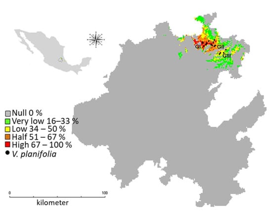 The potential distribution model of Vanilla planifolia Andrews identified three regions where there was a higher probability of finding this species and that could be considered as conservation areas for the germplasm present in the Huasteca region of Hidalgo [,]. This measure will prevent the disappearance of vegetation and changes in land use that reduce the potential distribution areas, as has been reported for V. planifolia in Oaxaca [], San Luis Potosí [,], and Mexico in general [].