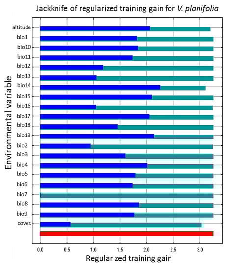 Subsequently, a Jackknife test [] was carried out, which allows for analyzing the contribution of each environmental variable individually and jointly, to form the distribution model of V. planifolia []. Therefore, through this test and the percentage of contribution of the species, the variables that locate the potential distribution of V. planifolia in the Huasteca of Hidalgo, Mexico were determined.