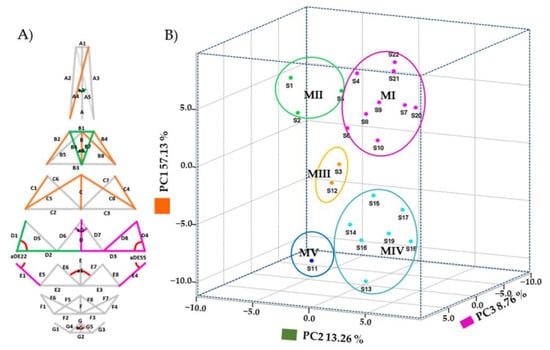 Although the variables of each PC are independent between each PC, as observed in Figure 8, the important variables are located in the same regions and are closer to each other; therefore, even though they are independent in the multivariate analysis, they are directly related to the structure of the labellum, a situation that was not observed in the published articles on Vanilla from San Luis Potosí and Oaxaca [,].