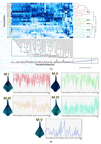 For PC3, the labellum on the positive side was longer in the right part of the middle region (D, D4, and D8) and the left part of the apical middle region of the labellum (E1). The labellum was narrower on the right side of the mid-region (D3 and aD) and short on the right side of the apical mid-region (E4). However, only Morphotype III was found in the positive part, while the other morphotypes were in the middle of PC3 (Figure 8). The morphological expression profile shows the behavior of each variable for each accession (Figure 9B). The variables with similar behaviors were grouped so that the five morphotypes were separated based on the differences of each accession. The height of the peaks corresponds to the value of each variable, and high peaks represent high values; therefore, Morphotype I is the one with the highest peaks for each accession, while it is the opposite for Morphotype V (Figure 9B).