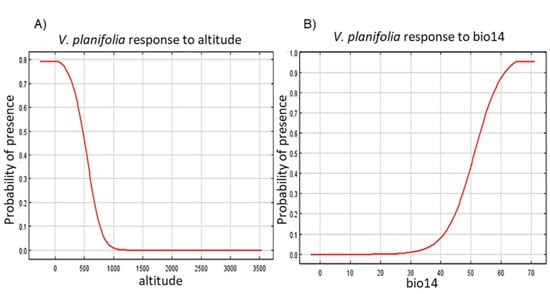 In the case of altitude, there is a greater probability of finding populations of Vanilla planifolia at lower altitudes than at higher altitudes for the Huasteca region of Hidalgo (Figure 10A). These values fall within the range that has been reported for other populations of V. planifolia that are distributed from 150 to 800 masl [,]; in Oaxaca they are located from 200 to 1190 masl [], and in the Huasteca Potosina, from 61 to 678 masl [].