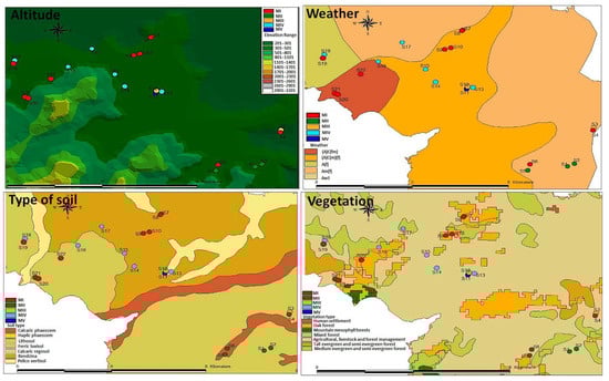 The largest number of populations (59.1%) was in the type of agricultural use cover. Vanilla planifolia was located in secondary vegetation, made up of acahuales for timber or Coffea arabica Benth plantations, and similar to that reported in the areas of Veracruz and part of Puebla [,,]. Further, 40.9% of the accessions were associated with tropical or subtropical evergreen broadleaf forests, which are mainly used for Coffea arabica plantation, and the cultivation of Pimenta dioica (L.) Merr., Ceiba pentandra (L.) Gaertn, and Pouteria sapota (Jacq.) H. E. Moore and Stearn (direct observation in the field). These conditions are similar to some acahuales in Puebla and Veracruz [,,], which serve as reservoirs for native species [,,].