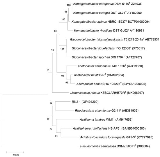 The family Acetobacteraceae was established in 1980 [1] and is involved in the order Rhodospirillales in the class Alphaproteobacteria. The family Acetobacteraceae presently comprises 46 genera with validly published names (https://lpsn.dsmz.de/family/acetobacteraceae (accessed on 3 April 2023)) [2]. Based on single-strand conformation polymorphism analysis, the 16S-SSCP profiles of DNA from Cladonia arbuscula indicated that members of the family Acetobacteraceae had a close phylogenetic relationship to the genera Gluconacetobacter and Acidisphaera, as well as to the species Rhodovastum atsumiense [3,4].