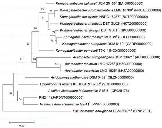 The phylogenetic tree was reconstructed using the UBCG (concatenated alignment of 92 core genes) pipeline based on whole-genome sequences of strain RN2-1T and the type species within the family Acetobacteraceae. Pseudomonas aeruginosa DSMZ 5071T was used as an outgroup. GenBank accession numbers are given in parentheses. Bar, 0.20 substitutions per nucleotide position.
