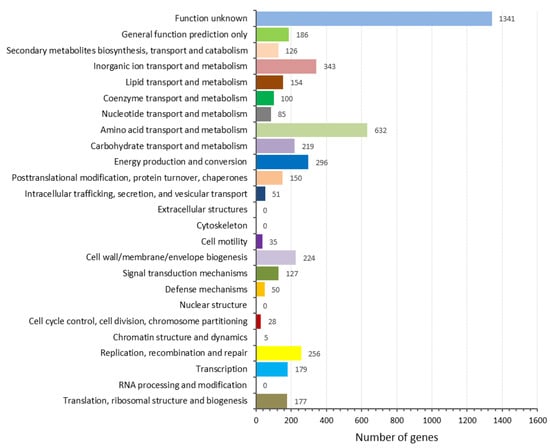 The results indicated that strain RN2-1T also clustered with the genera Rhodovastum and Acidibrevibacterium (Figure 3). The complete genome of strain RN2-1T was 5,373,152 bp in size, the N50 of the filtered reads was 173,752 kb, and the genome coverage was 23.45×. The G+C content of strain RN2-1T was computed as 68.7mol%. Rast analysis revealed the presence of 5057 coding sequences, 53 RNAs, and 448 subsystems in the genome of strain RN2-1T. A total of 5019 protein-coding genes were identified, and 4764 (94.91%) were assigned to COG categories. The COG category assignment of genes to general function prediction was only 3.9% (186 genes), and other known functions included amino acid transport and metabolism (13.3%: 632 genes), inorganic ion transport and metabolism (7.2%: 343 genes), and energy production and conversion (6.2%: 296 genes), whereas 28.1% of genes functioned unknown into the COGs (Figure 4). The function genes showed that RN2-1T might be classified as a member of the acetate-producing group with the presence of alcohol dehydrogenase (ADH) enzymes consisting of the alcohol dehydrogenase genes adh_1, adh_2, adhA_1, adhA_2, and adhT. These proteins, in relation to ADHs, were detected in the genome of strain RN2-1T (Table S5). The genome properties and statistics are summarized in Figure 5.