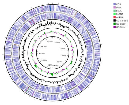 A graphical circular genome map of strain RN2-1T performed by the CGView server (www.cgview.ca (accessed on 25 March 2023)). From the outside to the center: rings 1 and 2 demonstrate the protein-coding genes (CDS) on both forward and reverse strands, ring 3 represents the GC content plot, and ring 4 represents GC skew.